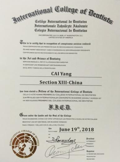 2018年蔡扬教授获得国际牙医师公司(ICD)中国区院士称号