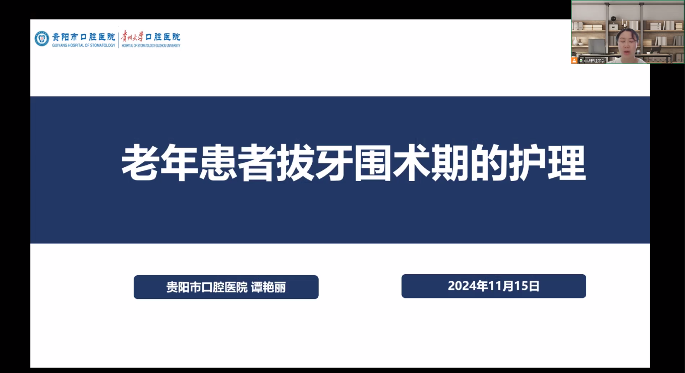 贵阳市口腔医院护理部副主任谭艳丽以“老年患者拔牙围手术期的管理”为题线上授课