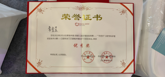 5月10日,青年护士李金芸在“口腔专科护理适宜技术大赛--口腔科水门汀调和护理技术”比赛中荣获优秀奖。