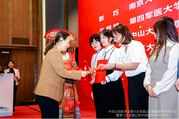 会上,蔡扬担任“口腔黏膜病研究展示”分会场评委,并为获奖者颁发证书。