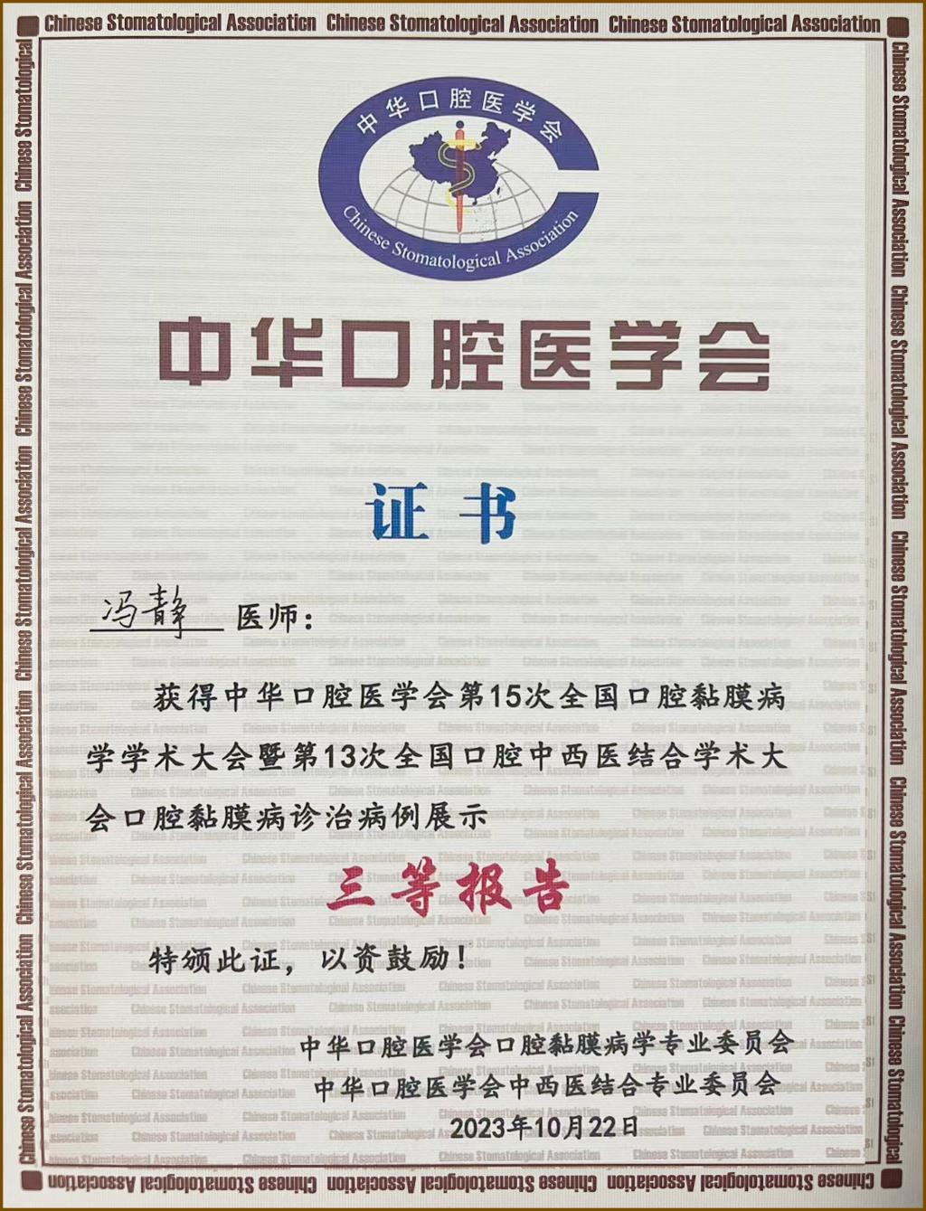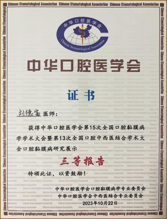 10月21日,牙周黏膜科住院医师刘德富在口腔黏膜病研究展示中以“亚甲基蓝光动力疗法治疗糜烂型口腔扁平苔藓短期临床疗效观察”为题进行演讲,并与其他院校的老师进行交流,荣获“三等奖”;研究生冯静以“误诊为坏死性肉芽肿的结外NK/T细胞淋巴瘤1例”为题在大会论坛上作病例分享,荣获“三等奖”。
