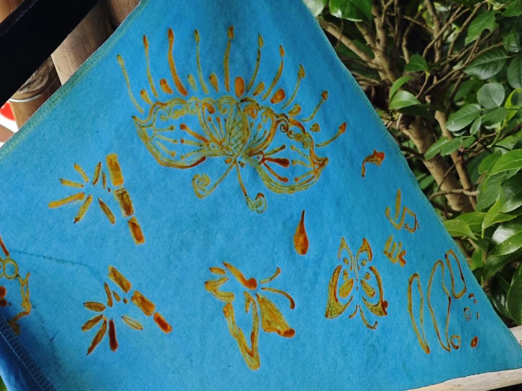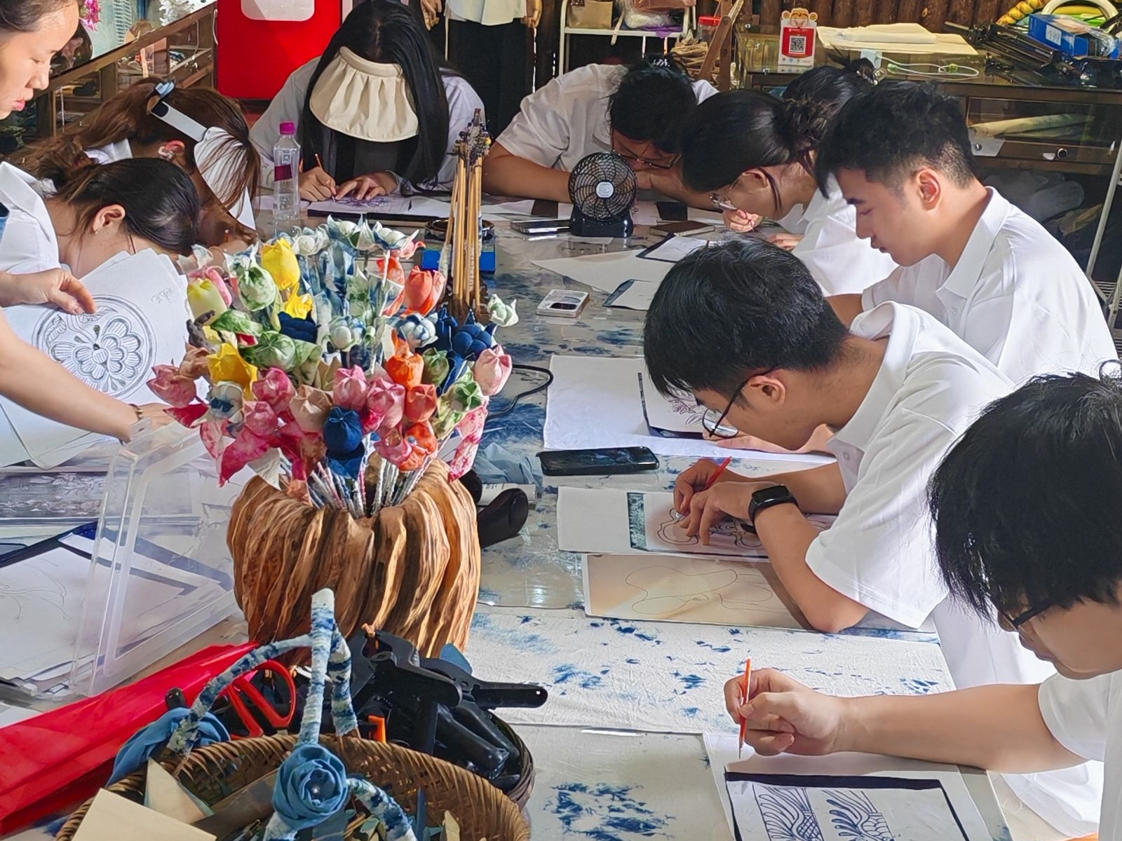 被誉为“画在布上的青花瓷”“布依族不需要出土的文物”的枫香染,有着悠久的历史和独特的艺术魅力,在非遗传人韦丽的带领下,实践队详细了解了染料的发酵制作和运用,并亲身参与到枫香染的制作,在晕染创作中感受传承文化的力量和民族的浪漫情怀。