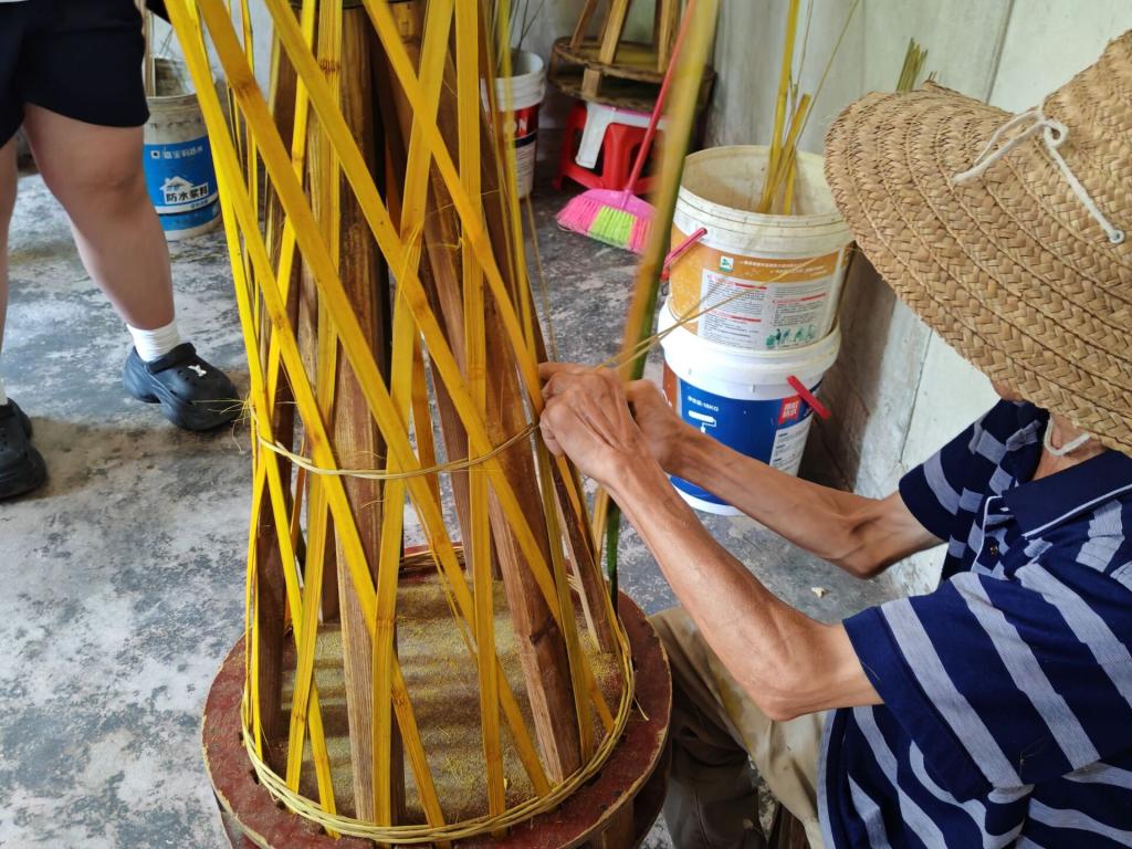 竹,作为古法造纸的重要原料,在当地人民的创造下成为了生活用品的制作材料,劳动人民凭借智慧与双手,将竹子切割制成薄片,经侵染、晾干等工序,编制成花篮、斗笠等实用物品,且这项技术沿用至今,实践队深入了解制作流程后,纷纷亲自动手参与编制、侵染等环节,在实践中感受劳动人民的智慧与巧思。