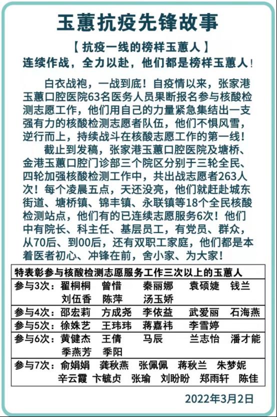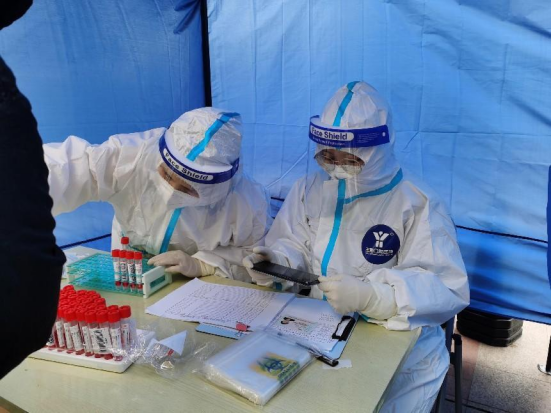 近期,公司“实践教学基地”——张家港玉蕙口腔医院在苏州市确诊人数不断增加的情况下,迅速启动一级防护预案,主动联系附近社区,希望能为全民核酸检测工作贡献绵薄之力,并按当地卫健委要求,暂停普通门诊,仅保留外伤、牙剧烈疼痛等急诊服务。2月16日,公司在该基地实习的2017级员工曾惜、李依益积极响应号召,主动报名成为了苏州市城东社区核酸检测志愿者,在参加“核酸检测信息采集以及防护服、隔离服穿脱”等岗前培训后,于2月18日开始进行志愿者服务并持续至今。