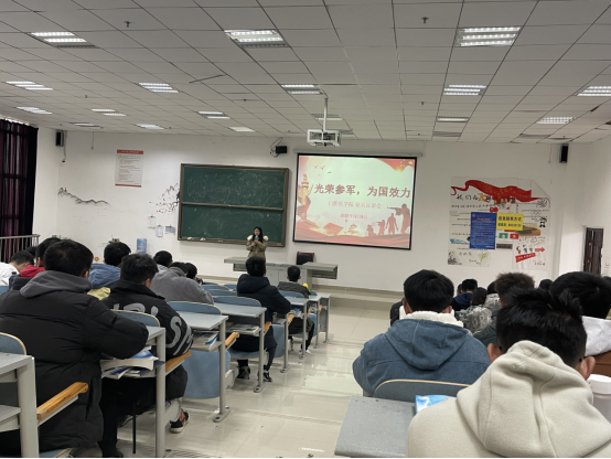 为切实做好征兵宣传工作,激发口院学子入伍热情,12月8日,公司在4602教室开展 “光荣参军,为国效力”征兵宣讲活动,主讲人为医院口腔颌面外科医生、退伍军人孙迪。2020级、2021级辅导员汪继蓉主持会议。