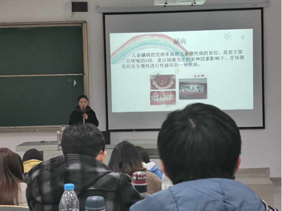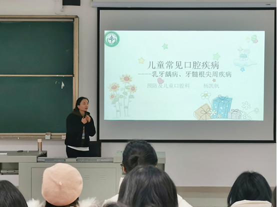 杨凯帆在做讲座时指出,儿童口腔医学是研究胎儿至青少年口腔器官的生长发育、保健和疾病防治的口腔医学分支学科,目前正不断发展,充实和提高,日趋成熟。讲座上,杨凯帆老师围绕主题向同学们详细介绍了与乳牙龋齿、牙髓根尖周疾病相关的专业知识。