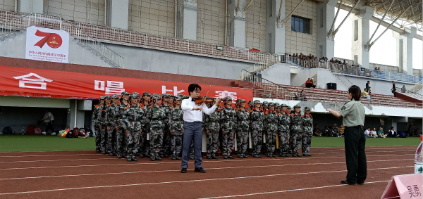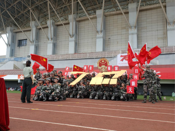 比赛如火如荼地进行着,各个公司为我们带来了一首首激昂的军歌,振奋人心。口院登场时,员工们迈着整齐坚定的步伐,青春的脸庞上洋溢着自信的微笑。音乐响起,大家迅速进入状态,他们在铿锵的鼓点下唱响了《太行山上》,唱出了所有中华儿女的心声,歌声嘹亮,歌声在体育馆久久没有散去。合唱中,同学们用纸板拼出“70”的数字,举着“精忠报国”的标语,表达对祖国最深切的祝福与最诚挚的热爱。最后,他们保持着军人的姿态,迈着整齐的步伐走出赛场,将19级新生在军训中获得的高素养体现得淋漓尽致。