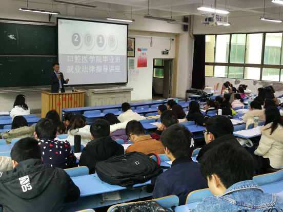 为进一步增强毕业生在就业择业过程中的自我保护意识,学习和掌握就业择业过程中的相关法律、法规、政策,2019年3月12日下午,williamhill邀请贵州中创联律师事务所专职律师包义晋(执业年限7年,擅长业务,刑事辩护,医疗纠纷,公司法,合同法,贵阳电视台法治频道大律师栏目长期合作特邀嘉宾),为毕业生开展就业法律知识专题讲座。口腔医公司党委副书记钱禾、员工管理科负责人张婷出席讲座,2019届毕业生100余人参加讲座。