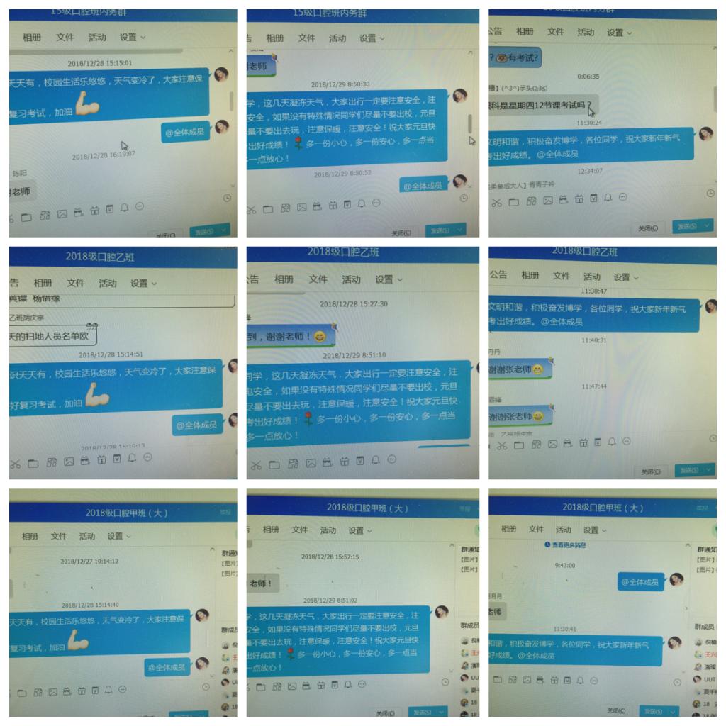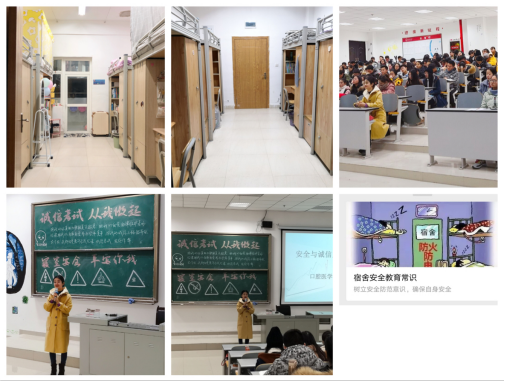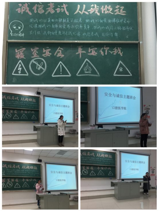 2018年12月26日--28日,口腔医公司在北校区、南校区分别召开以“诚信考试,从我做起,寝室安全,平安你我”为主题的活动,此次活动各班全体同学积极参与其中,同时口腔医公司党委副书记钱禾以及各年级辅导员老师也参与到活动中来。活动形式多样、内容丰富,主要采取以下形式进行:各班组织开展诚信---安全教育主题班会 、开展诚信---安全签名活动、诚信---安全每日一语活动、宿舍安全大排查活动以及安全常识推文活动。