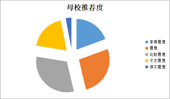 母校的推荐度:非常愿意:19.40%,愿意:26.87%,比较愿意:31.34%,不太愿意:19.40%,很不愿意:2.99%;