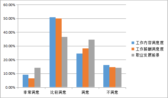 四、工作满意度(工作内容、工作薪酬、职业发展前景)(柱形图)