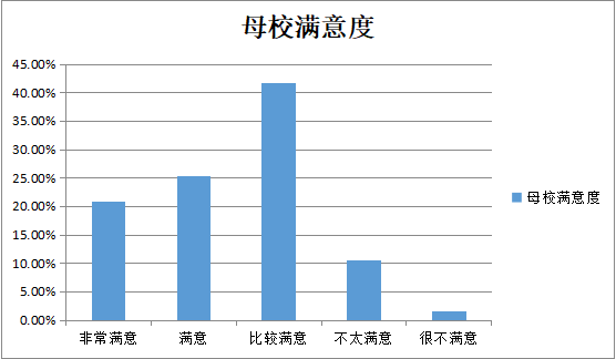 母校的满意度:非常满意:20.90%,满意:25.37%,比较满意:41.79%,不太满意:10.45%,很不满意:1.49%;