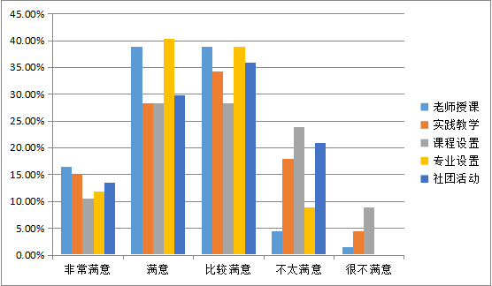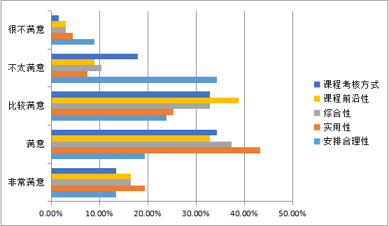 课程设置方面:非常满意:10.48%,满意:28.36%,比较满意:28.36%,不太满意:23.88%,很不满意:8.96%;