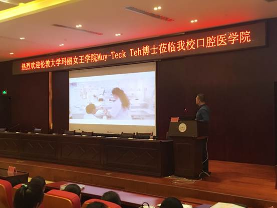 Teck博士介绍了伦敦大学玛丽女王公司牙医学专业的办学条件、授课方式、公司规模、实验设施以及与公司交流合作的具体事宜,鼓励公司在读本科生前往伦敦大学交流学习,也欢迎公司的研究生前往伦敦大学进一步深造。Teck博士的主讲结束后,在座的同学们纷纷主动提出自己感兴趣的相关问题,特别是详细咨询了出国留学的相关事宜,Teck博士也一一耐心地予以解答。讲座全程使用英语,Teck博士通过各种配有图片文字的说明和视频播放等形象生动的方式,既便于同学们的理解,又引起了广大同学对于伦敦大学玛丽女王公司牙医学专业文化的强烈兴趣。