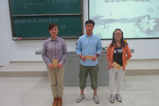 整场主题班会配着优雅的古乐旋律,宛转悠扬,通过同学们的详细介绍及慷慨激昂地朗诵表演,让我们感受到了国学经典文化的魅力。其中,国学益智类竞赛《一站到底》将此次班会推向高潮,比赛共分5个小组,每个小组进行初选,最后进行终极对决。现场比赛激动人心,台下观众不时地为场上选手的精彩表现拍手叫绝,经过层层选拔,最终有三位同学脱颖而出,被冠于“国学之星”的称号,他们分别是2013级的石前会、张人天,以及2014级的罗秋池同学。