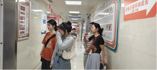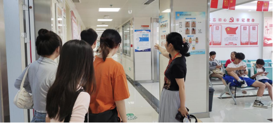 随后,胡睿带领各位员工参观了医院,并介绍了环境布局及各科室医疗业务开展情况,让大家对实习工作有了初步了解。