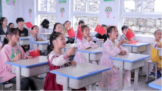 实践队还带领孩子们一起歌唱《我和我的祖国》,“我和我的祖国,一刻也不能分割。无论我走到哪里,都流出一首赞歌......”。在歌声响起的那一刻,大家全身心融入至歌曲,陶醉于其中,唱出的是每个人对祖国无限的热爱与依恋。