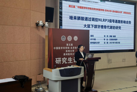 霍花同学秉承“初生牛犊不怕虎”的精神,以“唑来膦酸通过调控NLRP3信号通路影响趋势大鼠下颌牙槽骨代谢的研究”为题,图文并茂展现课题组研究内容及成果,在众多硕博研究生中脱颖而出,获得专家评审们的一致好评,最终取得三等奖的佳绩。