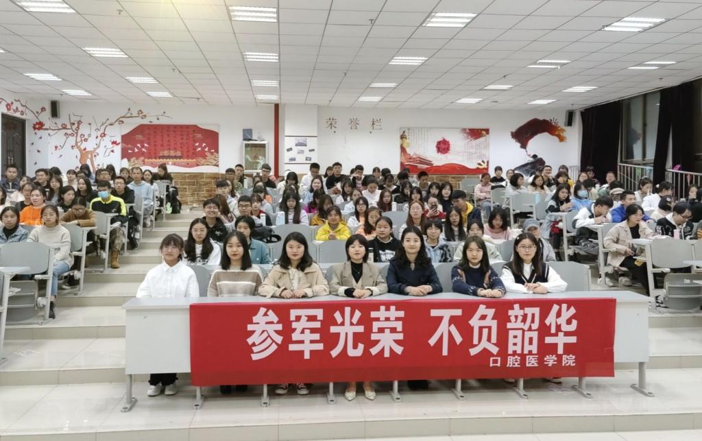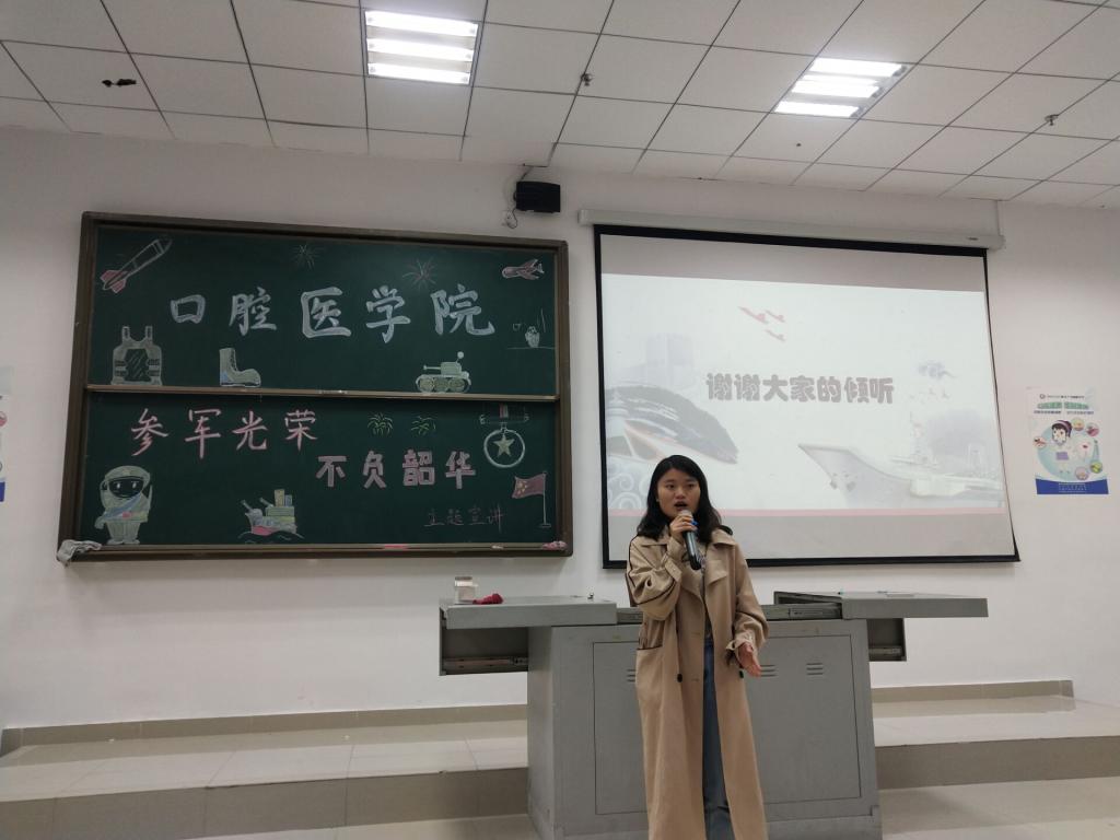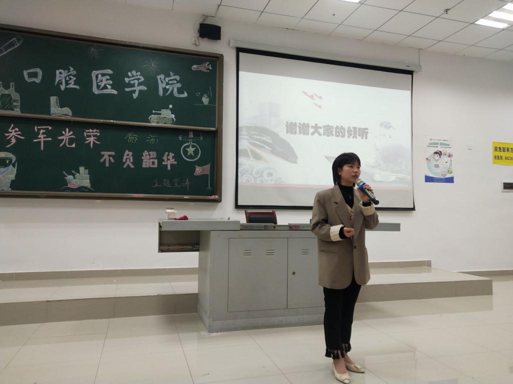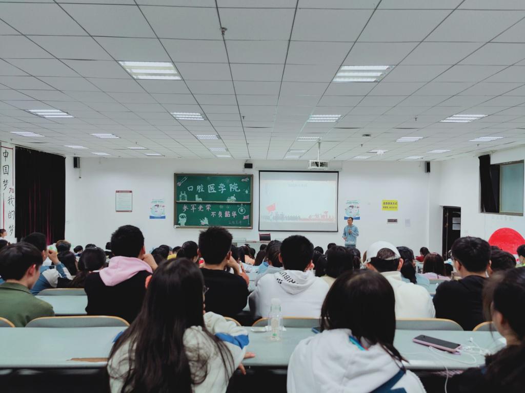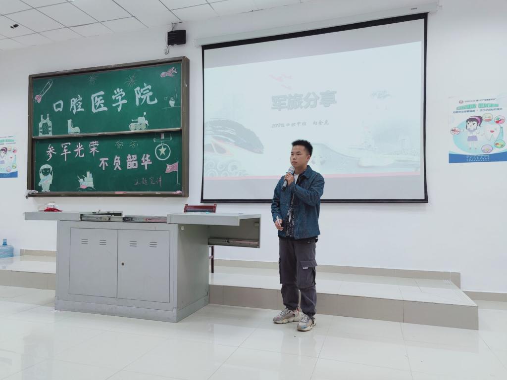 接着大家一起观看了两位退伍员工在贵医校园里拍摄的宣传视频,回到校园的他们依旧保留着在军营养成的良好生活作风,每天生活作息依旧规律,体育锻炼依旧没有懈怠,一套军体拳依旧打得流畅……宣传视频的余韵还未散去,王荣平同学就英姿飒爽地走上讲台,向大家分享了他的军营生活和感受。无论是祁连山下新兵训练的艰苦,还是刘根来连这个英雄连队的传奇故事,还是战友间质朴纯粹的感情,都让同学们听得热泪盈眶。向金虎同学则首先向大家讲述了他的蜕变之旅,从一开始门门落后到后来在母亲的鼓励下以优异成绩通过考核的故事,展示了在军营历练下不懈努力克服先天劣势的顽强品质,还为大家介绍了老员工征兵入伍的条件和流程,并且提到了地方、公司和公司为入伍老员工提供的优惠政策。