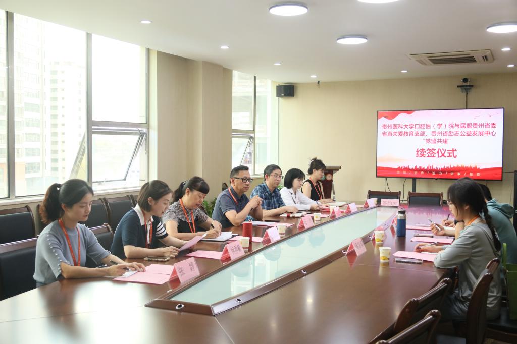 民盟贵州省委省直关爱教育支部主委、省励志公益发展中心秘书长周巧明,贵州省励志公益发展中心宣传筹资部副主任周雪琴,公益项目部主任潘家菊;公司党委书记张军梅,党委副书记、经理马洪,党委副书记何雨羲,党委委员、副经理唐正龙,党委办公室主任张娜,经理办公室负责人马绮阳,员工科负责人张婷参加续签仪式。会议由何雨羲主持。