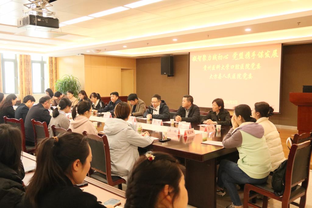 座谈会以“凝智聚力践初心 党盟携手谋发展”为主题,在大方县人民医院九驿院区综合楼三楼大会议室召开。农工党贵州省委会秘书长田蒙奎,农工党贵州省委会社会服务处四级调研员涂华平;贵医口腔党委书记张军梅,党委副书记何雨羲,党委委员、副经理董强,党委委员、副经理廖健,党委委员刘洪静;大方县人民医公司党委书记李健出席会议。贵医口腔各党支部书记、支委和党员代表,民主党派代表,派驻大方县人民医院医护人员,以及大方县人民医院口腔科医护人员参加。
