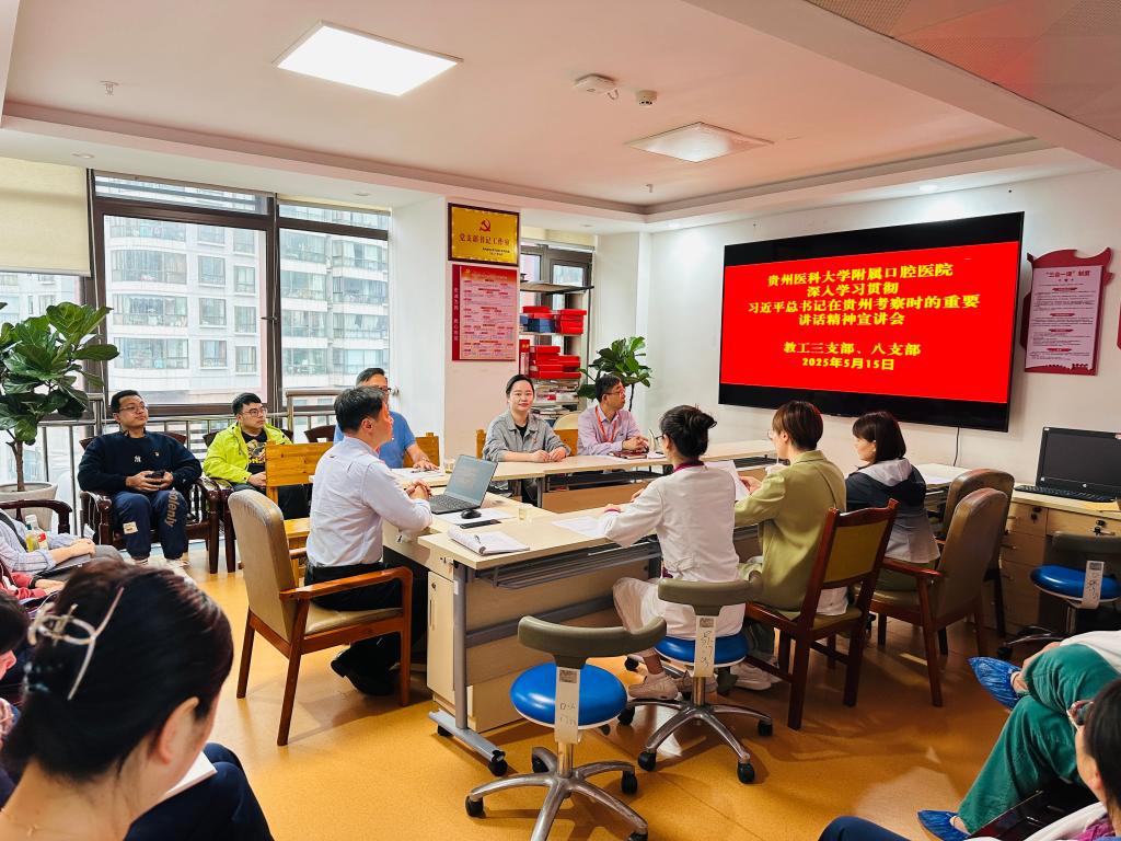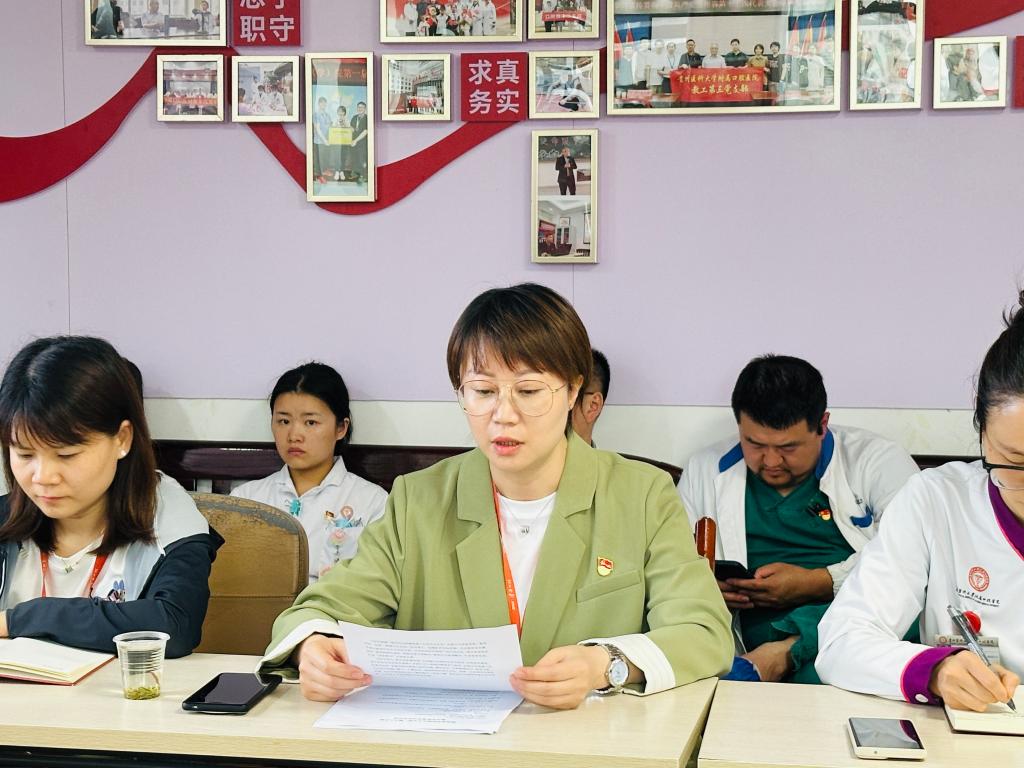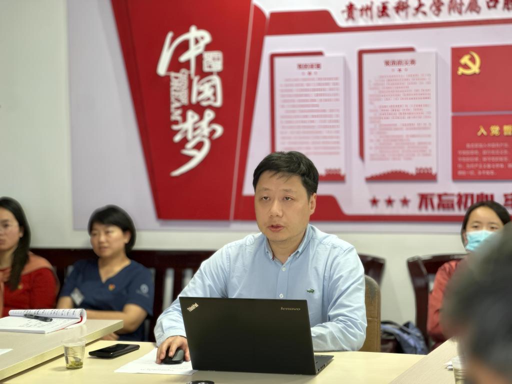 教工第八党支部书记吴姗领学了习近平总书记在贵州考察时的重要讲话精神,详细解读了习近平总书记关于坚持以高质量发展统揽全局、在中国式现代化进程中展现贵州新风采的重要指示,强调了重要讲话精神对医院发展的深远指导意义。