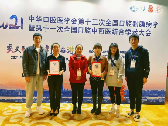 10月16日,牙周黏膜科主治医师王珣在口腔黏膜病研究论坛上以“口腔扁平苔藓病损中自噬相关因子LC3B、Beclin1及p62的表达与意义”为题进行演讲,并与其他院校的老师进行交流,荣获“潜力之星”;研究生赵进进以“光动力治疗顽固糜烂型口腔扁平苔藓病例报告”为题在大会论坛上作病例分享并荣获“新秀之星”。