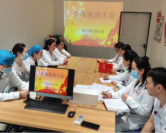 9月9日下午,教工第七(综合急诊)党支部在接诊大厅综合诊疗区二楼党员活动室就接收吕天竹博士为预备党员大会事宜召开全体党员大会,支部组织委员钟锟主持会议。