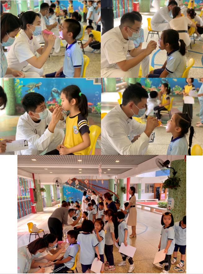 整个口腔宣教活动针对该年龄段儿童多发的龋齿问题、乳恒牙更替等,主要从乳牙龋、儿童涂氟、窝沟封闭、儿童牙病预防、刷牙等方面进行展开,考虑到不同年龄的儿童对于知识的接受程度和理解能力,根据不同年龄的儿童口腔的特点,各有侧重点的进行讲解。针对幼儿园小朋友对于新鲜事物的好奇性和探索性的问题,此次宣教更多的是采取问答、互动等方式进行展开,如正确有效刷牙方法的演示,刷牙儿歌的学习等,增加了趣味性的同时,也让小朋友们更好的掌握了有关口腔健康的知识,有助于小朋友们养成良好的口腔卫生习惯。此外,除了现场对幼儿园小朋友进行口腔宣教外,还通过一对一口腔检查互动的方式宣传口腔健康知识。100余名小朋友排着整齐的队伍有序地进行全面的口腔检查,医护人员认真登记填写检查表并给出口腔诊疗建议。