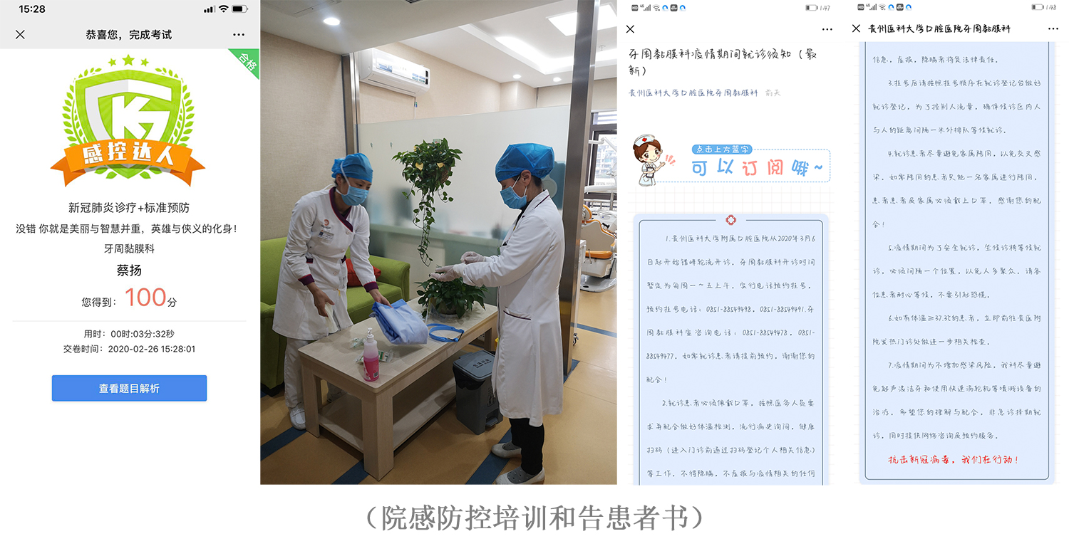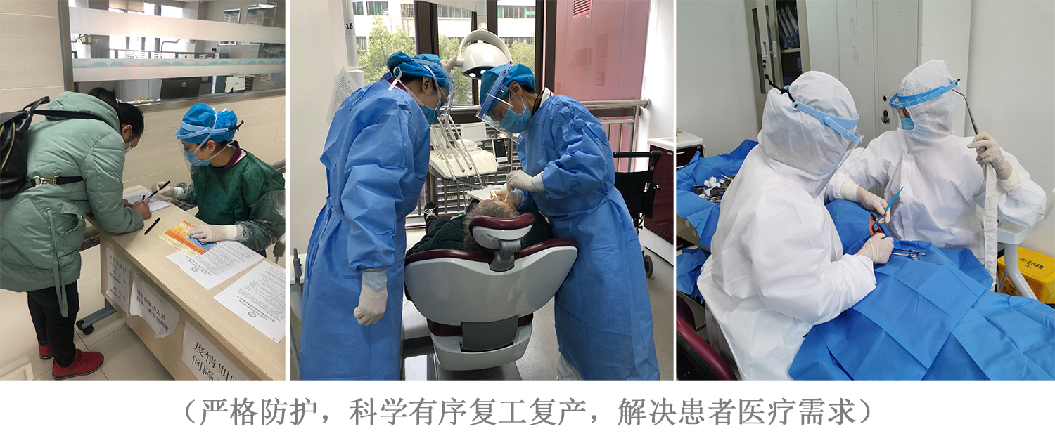 抗疫的第二阶段:在抗疫取得阶段性胜利后,为全面落实上级“一手抓抗击疫情、一手抓恢复生产”的要求,3月份开始,支部带领科室积极为全面开诊做准备。牙周黏膜党小组及时在科室公众号发布“牙周黏膜科疫情期间就诊须知”,在严格院感防控和医护防护的前提下,科学有序复工复产,党员同志带头投入临床工作,解决口腔患者的诊疗需求。