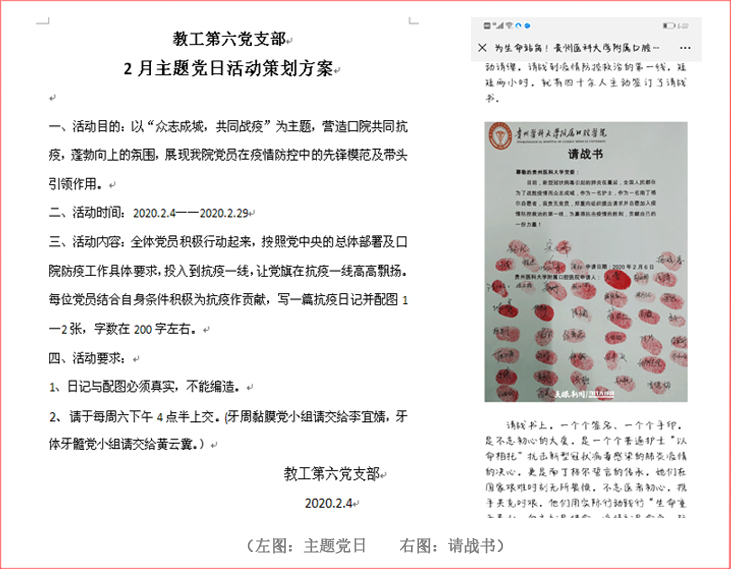 为充分发挥基层党组织在疫情防控工作中的战斗堡垒作用,教工第六党支部紧密结合疫情防控工作,积极主动为打好这场疫情防控阻击战做出贡献。2月份,开展主题党日活动“众志成城,共同战疫”,号召全体党员行动起来,按照党中央的总体部署及口院防疫工作的具体要求,投入到口院的抗疫一线;支部书记蔡扬曾多次参加williamhill官网附属医院感染科关于新冠肺炎患者的全院会诊,为新冠肺炎患者的口腔疾病提出专业诊疗方案,并与药剂科主任陈萍代表医院为新冠肺炎病人捐赠口腔治疗专用药物;院内党员护士主动写下请战书要求支援武汉抗疫一线;支部全体党员响应公司党委号召自愿捐款支持疫情防控,同时,支部不忘关心贫困员工就业的帮扶工作,党员罗亮作为本支部指定贫困员工帮扶联络人,密切与帮扶对象进行沟通,了解其思想动态及困难,积极为贫困员工存在问题进行疏通排难;按照省教育厅“停课不停学”的总体部署,党员教师不忘教书育人职责,积极采取各种线上教学方式为本科生开展多种形式的网上教学活动。