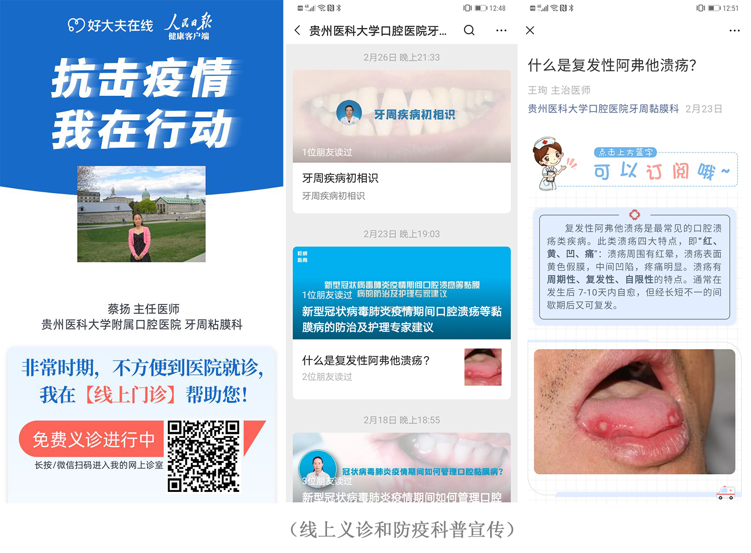 抗疫的第一阶段:1月22日,“新型冠状病毒” 疫情防控战全面打响,支部党员充分发挥模范带头作用,牙体牙髓党小组承担着急诊及疫情期间口腔急诊患者的诊疗工作,支部其他党员轮流参加导诊、预检分检点工作;支部党员通过微信等途径开展网上义诊,积极宣传新冠肺炎的防疫防控知识;牙周黏膜党小组创建科室微信公众号,进一步宣传防疫知识和口腔科普,并在线上为有口腔医疗需求的患者答疑解惑。