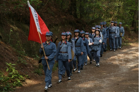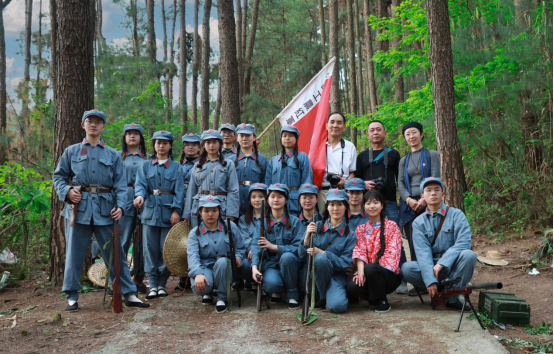 火伞高张的午后,身穿红军服的党员队伍,肩扛粮食、手抬担架、臂挽伤员,走在崎岖的山路上。飘扬的红旗、嘹亮的军歌、整齐的步伐生动的再现了红军当年峥嵘岁月的革命场景。抬眼望向林边的自建房让大家深深的感受到在党的坚强领导下,祖国正在蓬勃发展。