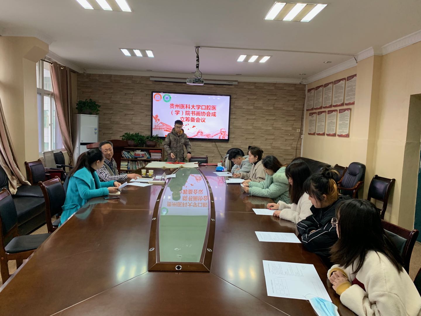 在建党100周年之际,为更好弘扬和发展中华传统文化,培养师生注重动手实践能力,丰富全院精神文化需求,进一步推动全院文化创作和队伍建设,2月9日下午,口腔医(学)院在行政楼五楼会议室举行书画协会筹备会议。副经理王永、党委副书记何雨義出席会议,工会主席杨蕾、员工科负责人张婷、生产实习科科长胡睿、院团委副书记蒋韵娴、分团委副书记刘逸洲及员工代表参加会议。