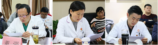 在听取了唐正龙副经理的主题发言后,修复种植科主任董强、口腔解剖生理学教研室主任贾莹、教工第一党支部(行政后勤党支部)书记周天分别作了学习发言。