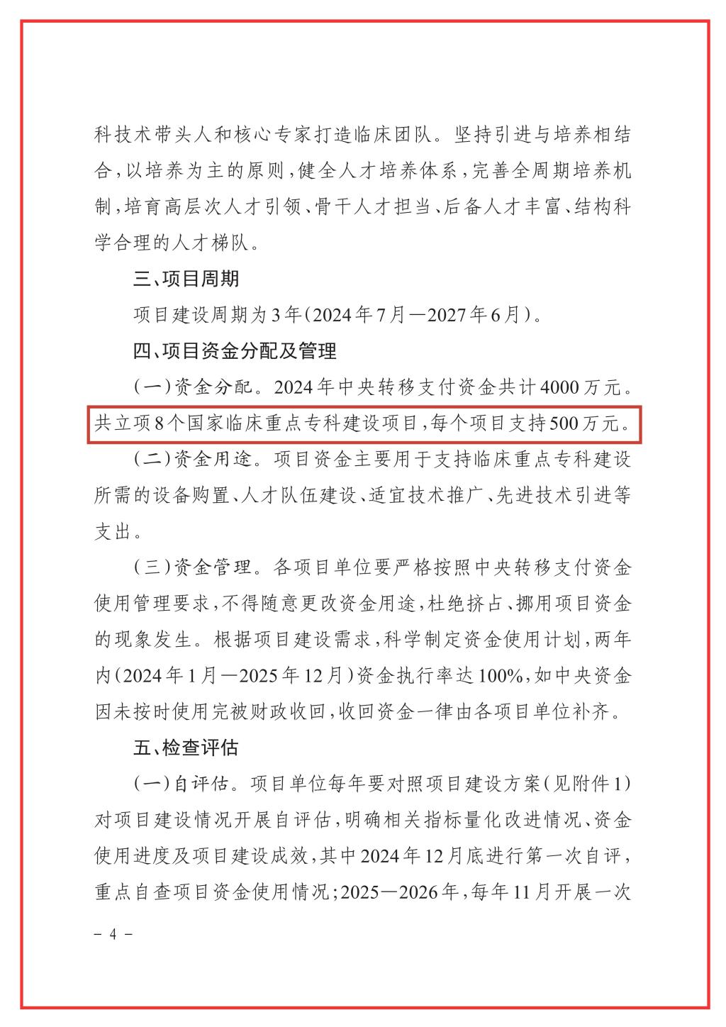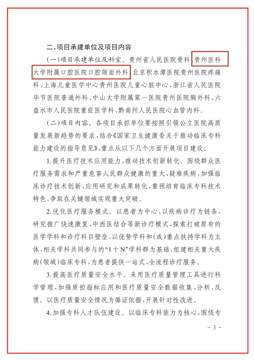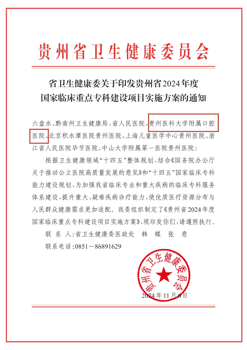 近日,贵州省卫生健康委员会印发了《省卫生健康委关于印发贵州省2024年度国家临床重点专科建设项目实施方案的通知》,公司口腔颌面外科获批为国家临床重点专科建设项目,2024年中央转移支付资金共计4000万元,共立项8个国家临床重点专科建设项目,公司口腔颌面外科为其中之一,项目建设资金500万元。