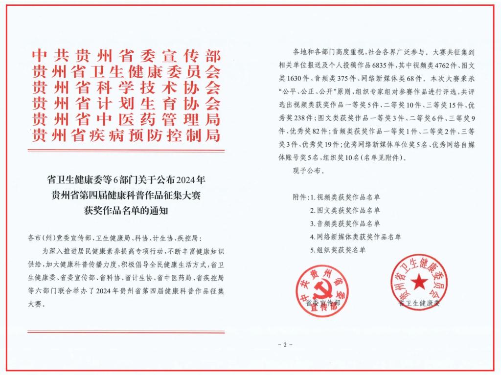 近日,贵州省卫生健康委员会等6部门发布《2024年贵州省第四届健康科普作品征集大赛评审结果公示》,公司的3部作品在6835件投稿作品中脱颖而出,荣获佳绩!