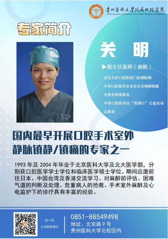 在2022年8月30日-9月8日期间,关明教授将围绕手术室外麻醉,舒适化牙科诊疗以及静脉镇静镇痛技术进行深入指导。有舒适化治疗需求的患者到院可享受北京知名专家的医疗服务,欢迎广大患者前来咨询就诊!