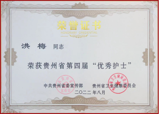 洪梅在临床工作中兢兢业业、勤劳刻苦,分别于2019、2020、2021年获得年度工作考核优秀;2019年度获得“优秀护理组长”称号;2020年获得公司的“第8期发展对象培训班获得优秀学员”称号;2022年度获得“优秀护士长”称号。
