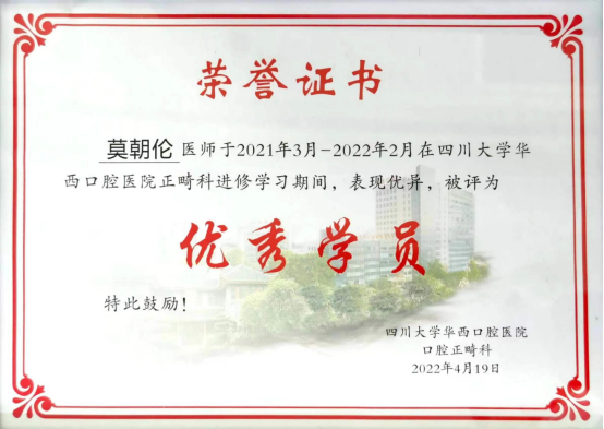 在医院及科室领导的大力支持下,公司口腔正畸科医师莫朝伦于2021年3月前往四川大学华西口腔医院口腔正畸科进修学习。进修期间主要以临床工作学习为主,同时与华西williamhill研究生一起进行《口腔正畸学》理论课程学习,并以优异的成绩通过了分阶段进修学习考核。经过一年的系统学习,在来自全国各地近40名进修学员中,以第一名的优异成绩,荣获华西口院授予的“优秀学员”称号。