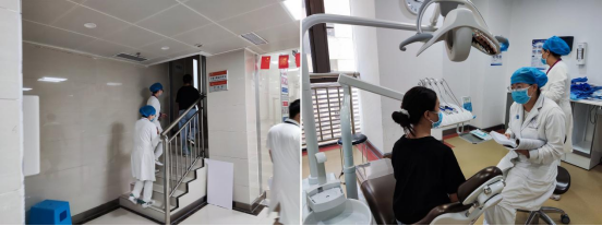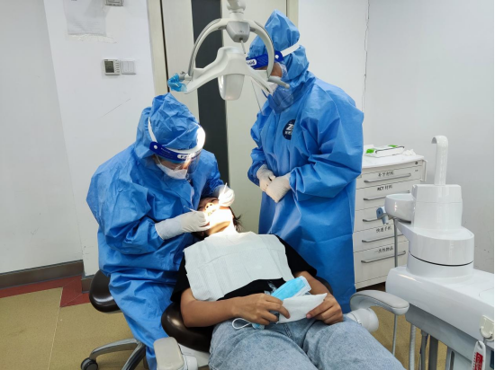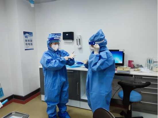 9时15分,患者进入诊室,安排牙体牙髓科医生、护士各一名,互相配合戴防护口罩、着防护服、防护面屏、鞋套、双层手套,如火如荼开始诊疗。从人员管控、通道消毒到诊疗间个人防护和物品传递,再到患者途经通道终末消毒和医疗废物正确处置……室内、室外的工作人员密切配合、紧张有序地实施救治!