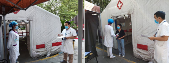 此次演练于上午9时正式开始,拟有一名近期自中风险地区返黔患者突发急性牙髓炎需紧急止痛救治,预检分诊点体温测量37.8℃,其持有48小时内该中风险地区核酸结果阴性证明,且在抵黔后24小时进行了1次核酸检测,在公司核酸点已采样但结果未出。预检分诊人员详细询问并排除其流行病学史和新冠肺炎相应的临床症状,但其发热原因不明。首诊医务人员请示院总值班救治方案,院总值班按预定应急流程进行医疗救治。