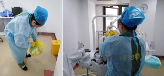10时15分,开髓手术顺利结束,患者疼痛消失,病情稳定,由医务人员闭环式陪同至定点医院发热门诊,做好交接登记。10时25分,患者离开诊室,保洁员对诊间物表、地面、空气做消毒处理,并及时处置过程中产生的医疗垃圾、生活垃圾。