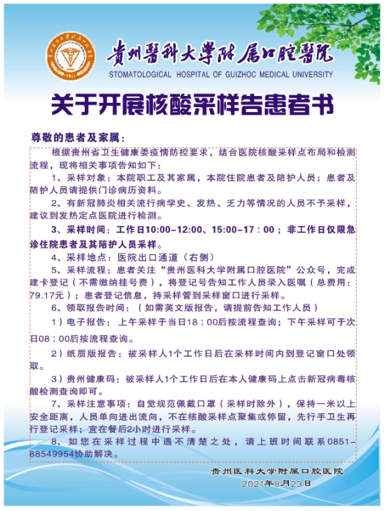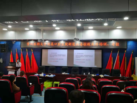 医院组建素质过硬的采样骨干队伍,经贵阳市云岩区疾控中心和医院感染管理科全面培训,考核合格后持7天内核酸阴性结果方可上岗,严格执行“二级防护”,规范执行手卫生,热情、耐心、勇敢投入“抗疫”工作,规范操作获取每一份检测标本。采样后12小时提供常规中英文版电子及纸质报告,6小时内提供急诊报告,严格把控“检阴入院”防控关,满足人民群众的就医需求。