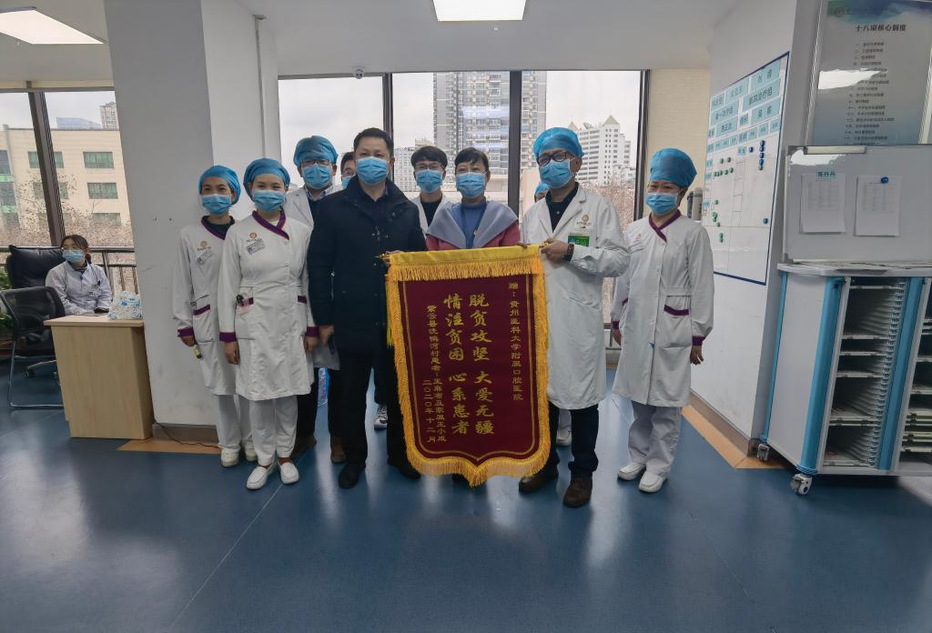 对于医院的优质诊疗、费用减免和医护人员的精心照顾,王大爷深受感动,特于2021年1月25日委托驻村脱贫干部巩晓(省地方金融监管局一级调研员、紫云县火花镇洗鸭河村第一书记)来院赠送锦旗,以表其对williamhill官网附属口腔医公司党委及全体医务人员的感谢。