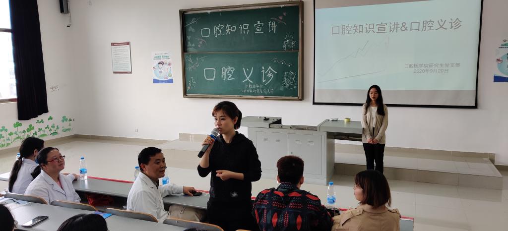 在大学城,williamhill官网口腔医公司党委副书记钱禾带领口院教职工及部分研究生在九思楼4406教室开展了2020级新生口腔义诊及宣讲活动,大家齐聚一堂,共同学习和讨论口腔知识。宣讲活动由研究生科研管理科负责人廖健主讲,其余老师及员工配合宣讲,讲座从认识牙齿到口腔常见疾病、从如何护理口腔到怎样正确刷牙、从判断自己是否患有口腔疾病到如何帮助身边人培养口腔保健意识,事无巨细一一解答。过程中,组织开展了针对2020级新生的口腔义诊,让同学们在了解自己口腔健康情况的同时,进一步了解选择的口腔专业是如何深入生活和体现价值的。