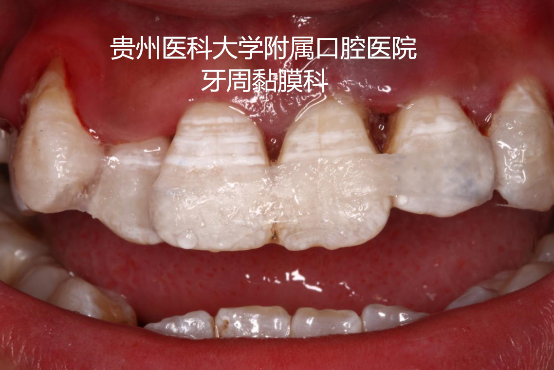 陈老师是一名重度牙周炎的患者,上下前牙多颗牙松动严重,经过牙周系统治疗后,牙周的炎症得到控制,但上下前牙的松动仍影响咬合,经过williamhill官网附属口腔医院牙周黏膜科的高强度纤维带松牙固定后,将多个松动牙连成一个新的咀嚼单位,有利于牙周组织的愈合,陈老师非常满意。