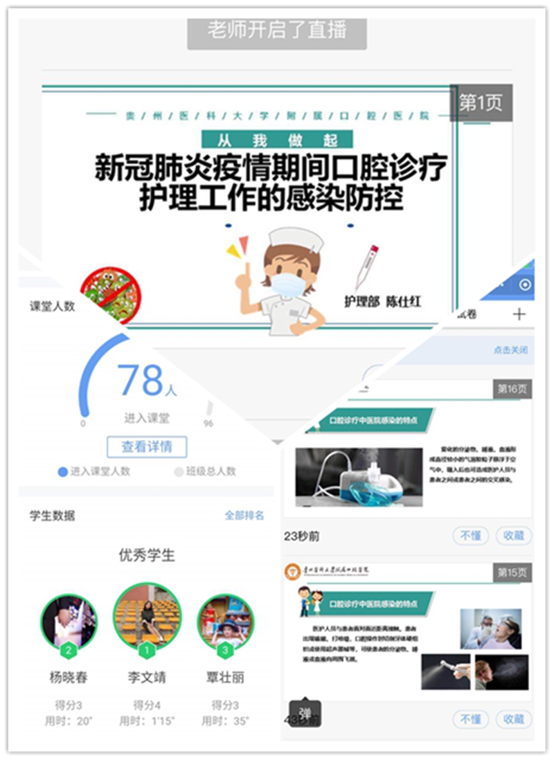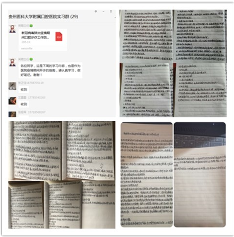 因疫情特殊时期,为保证实习生安全,根据医院统一部署,公司实习同学暂不回医院上班。护理部特为护理实习生制定了学习计划,每周在实习生群内下发学习资料,要求实习同学及时学习,并每周五下午18:00前将学习笔记发在实习群内,由护理部统一收集检查,同时采用雨课堂线上语音授课方式为实习生和全院护士进行理论培训。