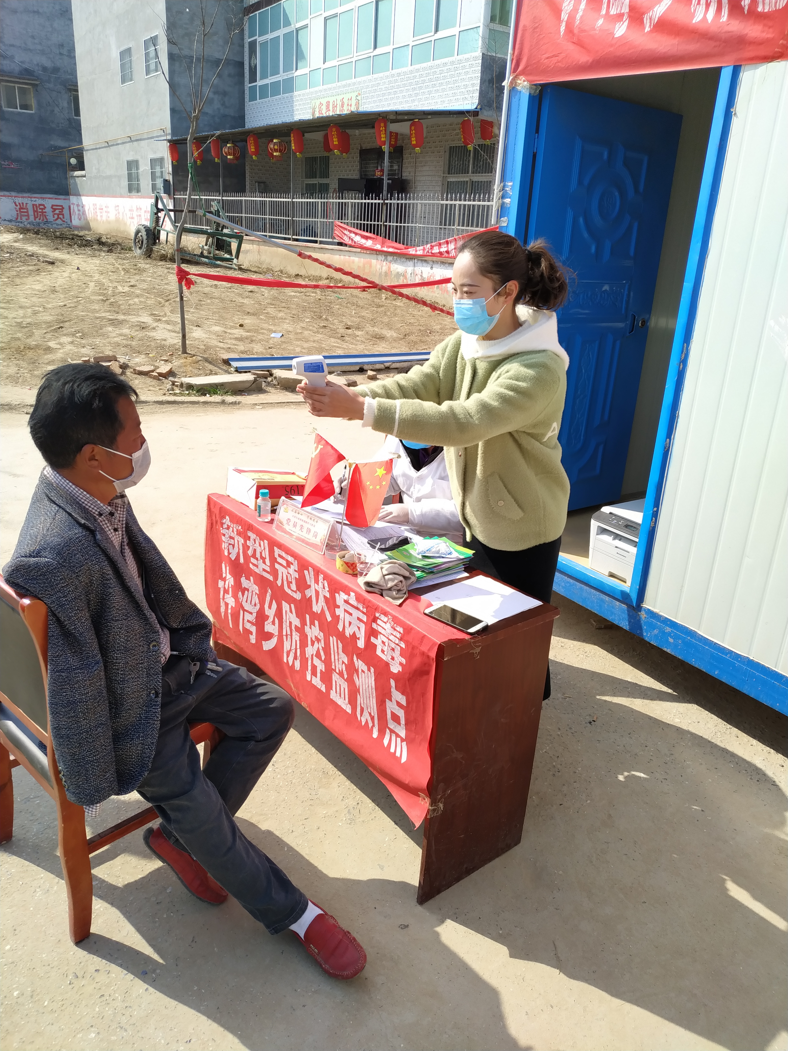 研究生党支部副书记李芳同学自愿加入当地村委会社区疫情防控志愿工作,帮助做好过往村民的体温检测和登记工作。