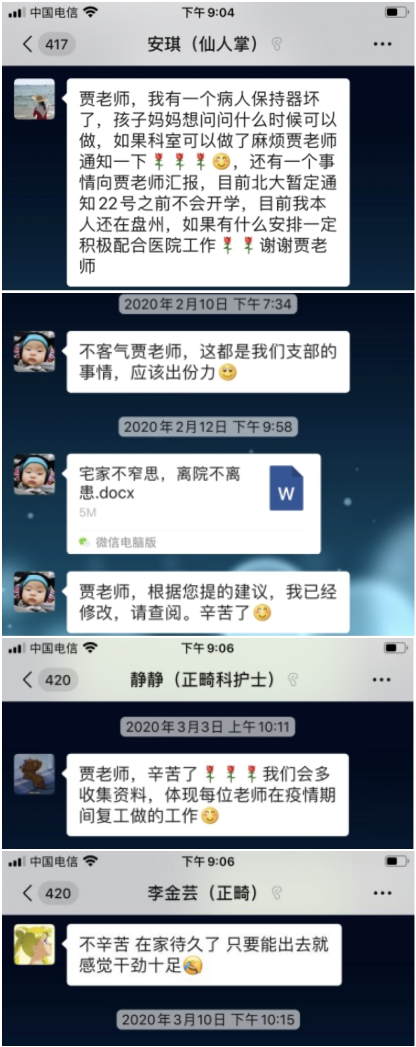 抗疫期间,科室负责人开启霸屏工作模式,在科群WeChat发布信息1000余条。保证所有通知第一时间传达至科室每一位成员,保证一小时内完成相关工作部署并启动执行。无论党群,不分长幼,对于工作,看到的永远是支持与配合!